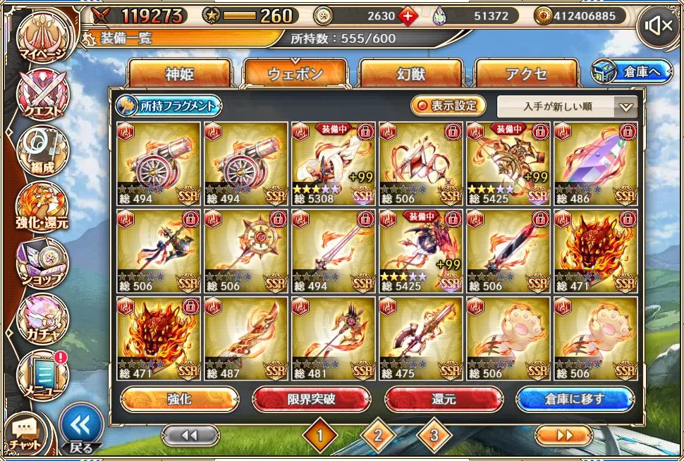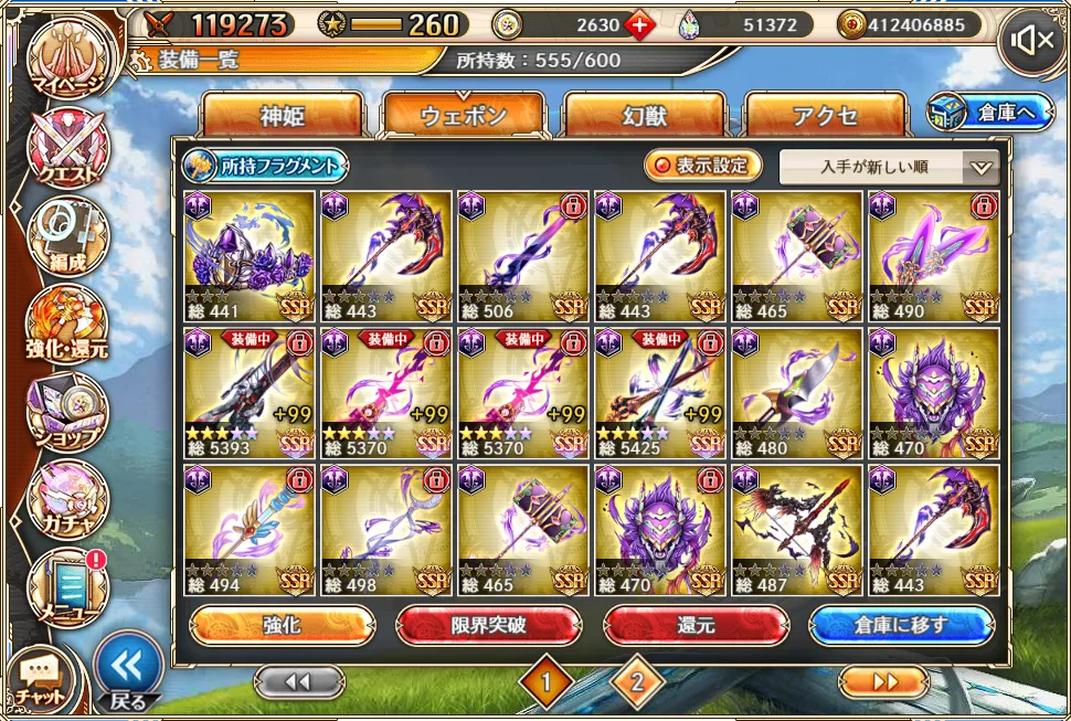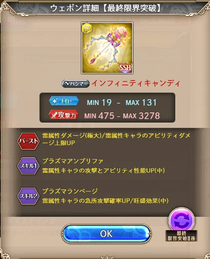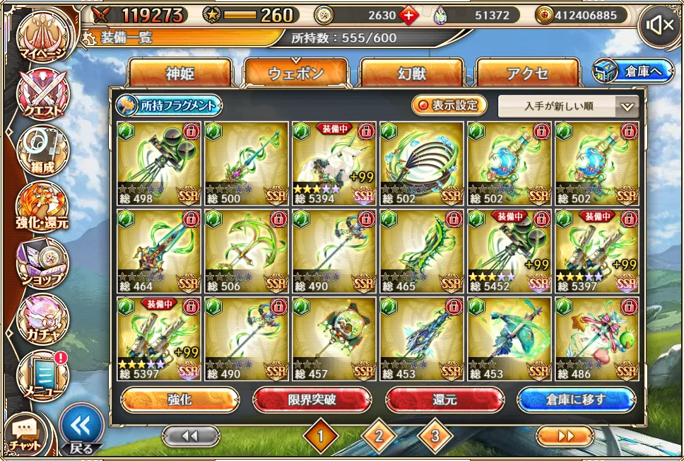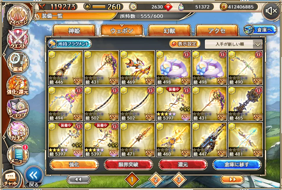 かといって今ピックアップガチャで来ている雷チェンシー武器(旺盛中・急所中・エクシ中)を取りに行くお金もなく、雷も強化保留でしょうか。