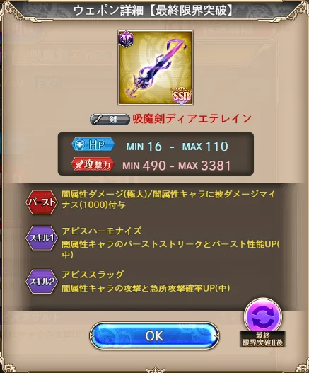 こちらは心想昇華ディアボロス武器です。こちらもヘクトル砲編成強化のためにシェオル武器と交換が良さそう。