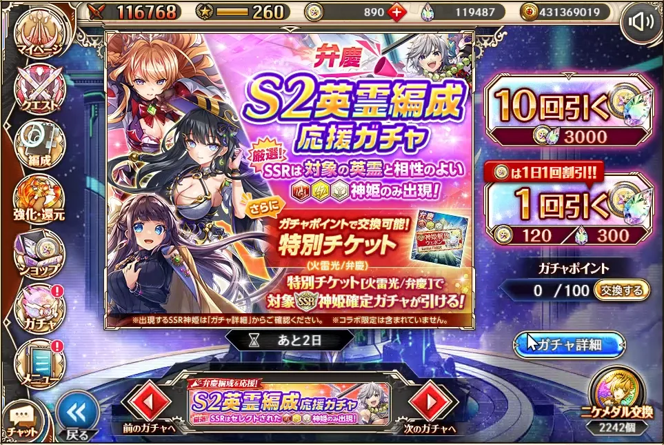 では初めて引くS2英霊編成応援ガチャですが、どのような引きになるか見ていきたいと思います。